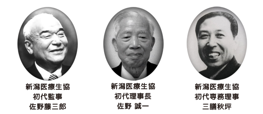 戦後まもない頃から「地域農業の振興、農民の地位向上」のために第一線で運動してきた佐野藤三郎、佐野誠一、三膳秋坪の三氏は、この願いを真正面から受け止めました。地域の願いは「住民自身が取り組まなければ解決しない」と病院を核とした「医療と福祉のまちづくり」が必要であると考えた三氏は、医療生協による病院づくりを決意したのです。昭和50年に1300名の組合員によって新潟医療生協が設立されました。
